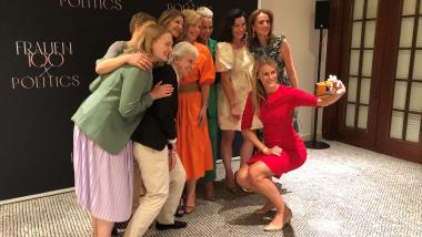 Der Westen - Am Mittwochabend haben sich Politikerinnen aus den verschiedensten Parteien in Berlin getroffen, um gemeinsam mit der Initiative „Frauen100“ ein Zeichen für Frauensolidarität zu setzen. Im Bild (von links nach rechts): Ria Schröder (FDP), Franziska Brantner (GRÜNE), Marie-Agnes Strack-Zimmermann (FDP), Schauspielerin Ursula Karven, Julia Klöckner (CDU), Silvia Breher (CDU), Unternehmerin Zarah Bruhn, Dorothee Bär (CSU), Unternehmerin Verena Pausder.